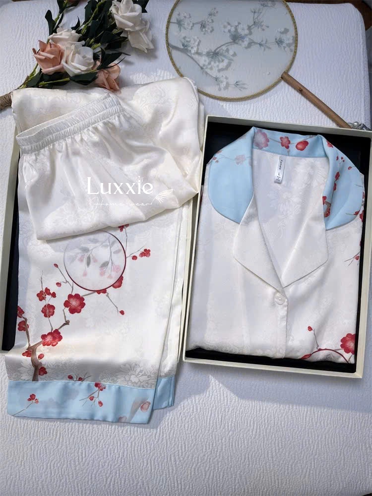 N101 Pijama lụa gấm trắng hoa đào viền xanh da trời