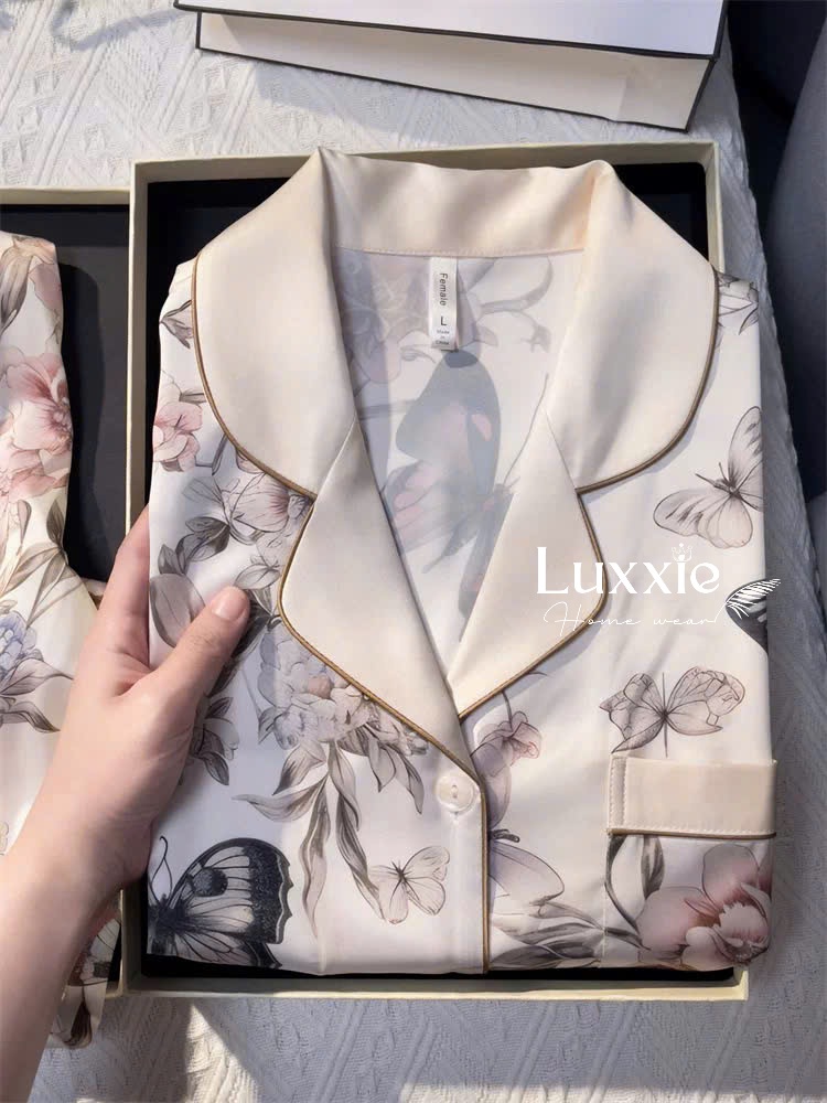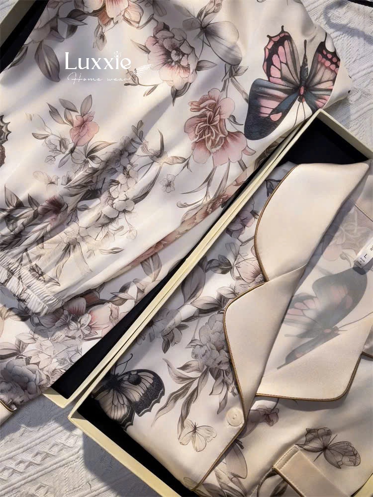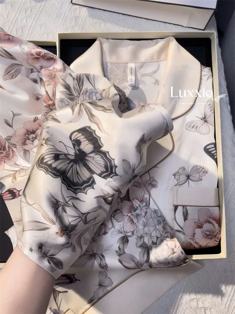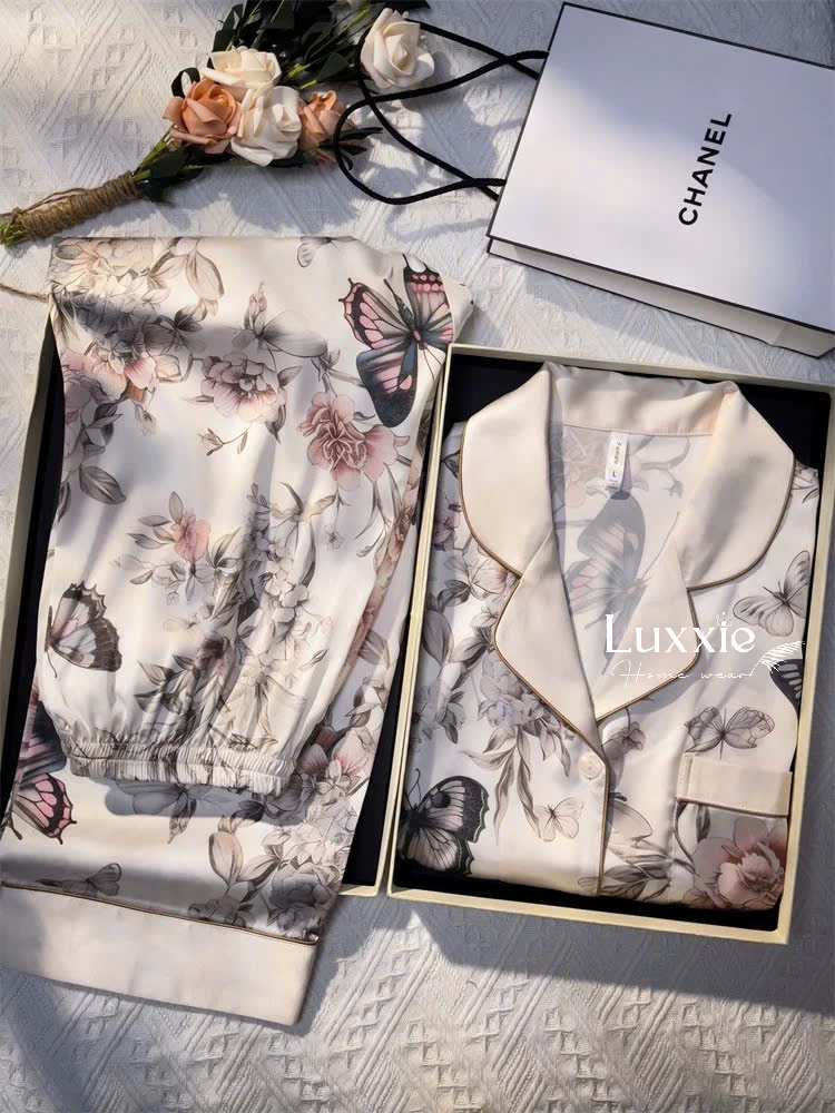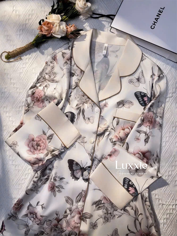 Hoa và bướm được in toàn bộ set đồ – vừa mềm mại, bay bổng vừa tạo điểm nhấn riêng biệt mang đậm nét nữ tính và thanh lịch.