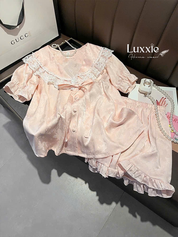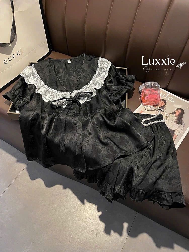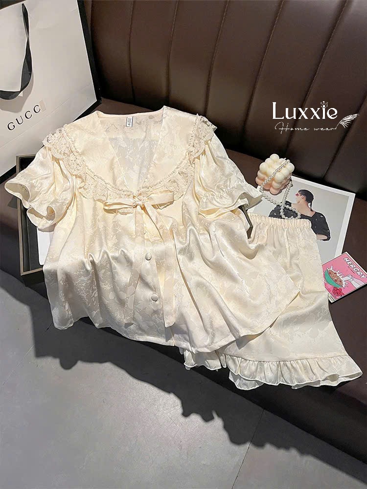 Set pijama lụa ren cổ vuông phong cách Pháp – ngọt ngào, quyến rũ và đầy tinh tế.