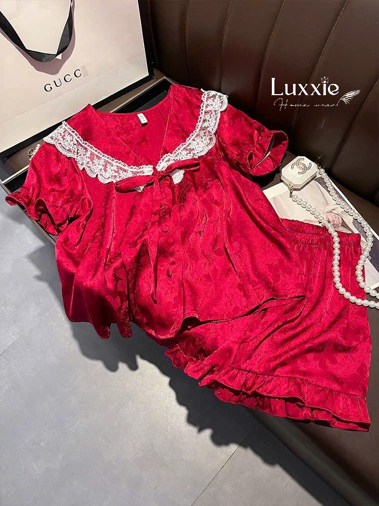 N108C Pijama lụa gấm hoa cổ ren trắng buộc nơ cộc đùi