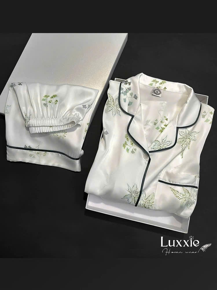 Nền trắng tinh khôi, điểm xuyết họa tiết lá xanh nhạt in rải rác – mang lại cảm giác tươi mát, nhẹ nhàng. Viền cổ, tay áo và gấu quần được phối chỉ xanh rêu đậm, tạo điểm nhấn nổi bật nhưng vẫn hài hòa và tinh tế.