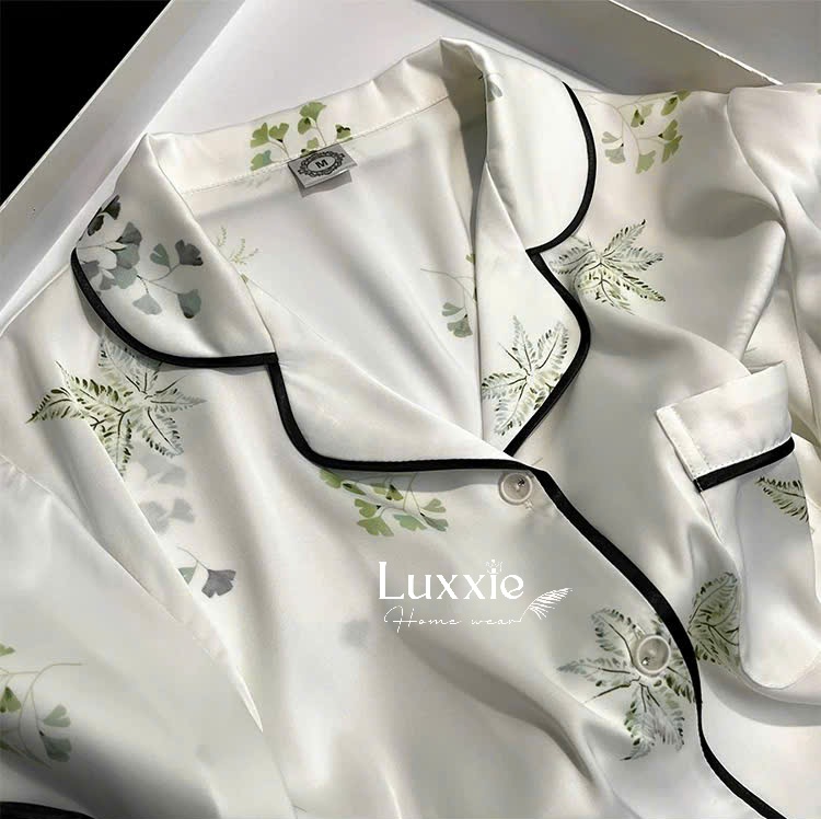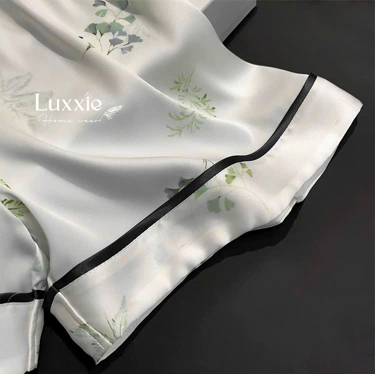 N110C Pijama lụa hoa lá thiên nhiên viền xanh cộc đùi