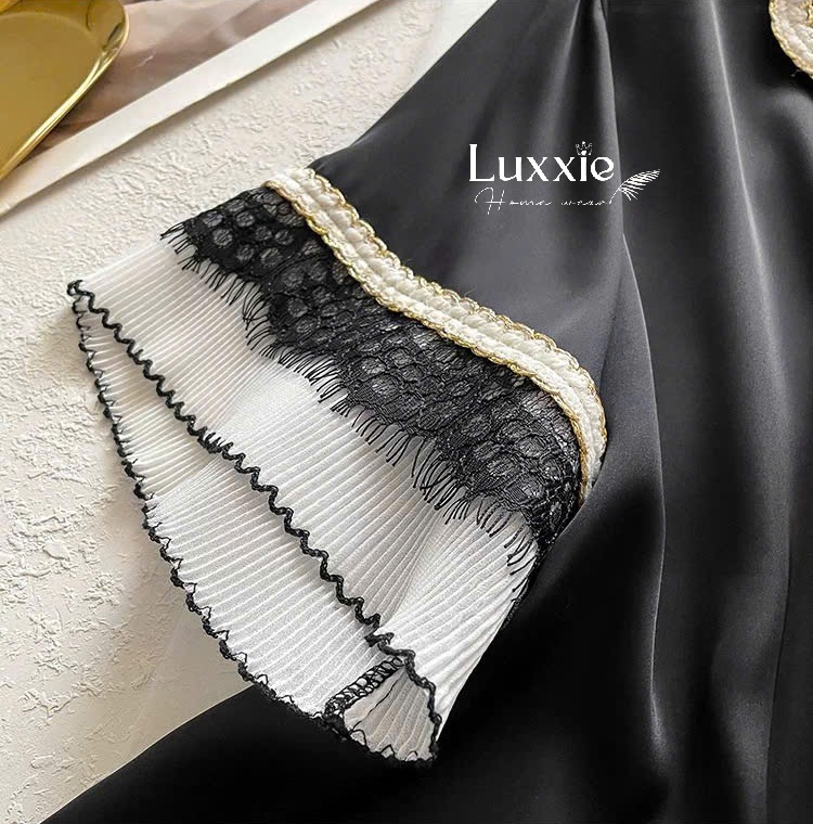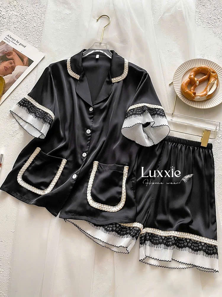 Set pijama lụa ngắn tay phối ren cổ điển – khi vẻ đẹp quý phái gặp sự thoải mái tuyệt đối trong từng đường kim mũi chỉ.