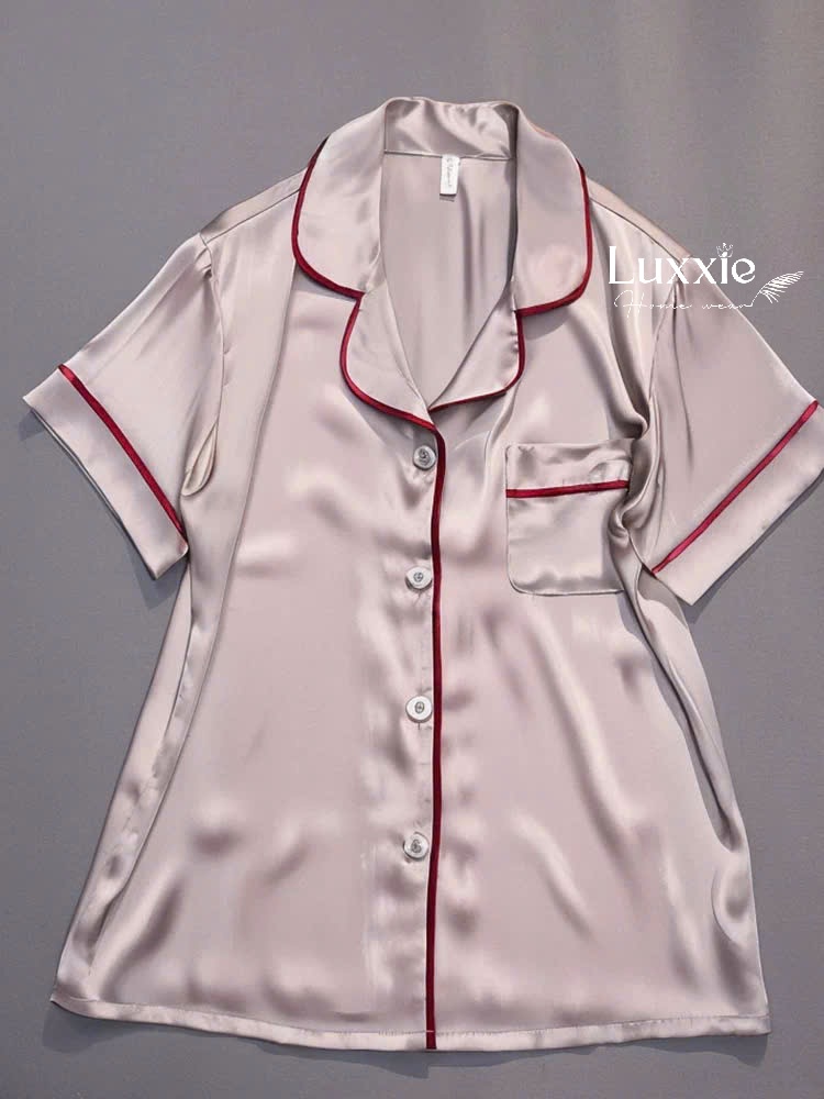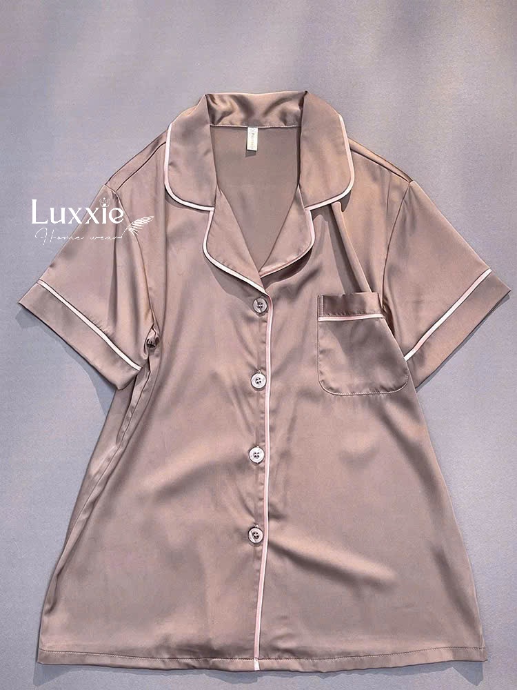 N114B Pijama lụa trơn bo viền chỉ cộc tay
