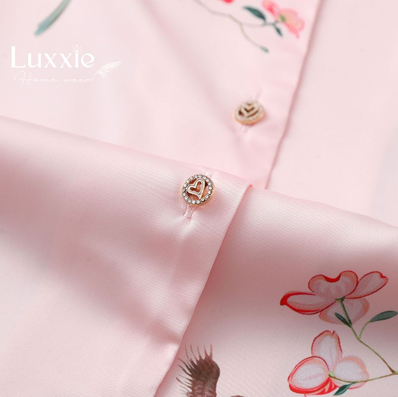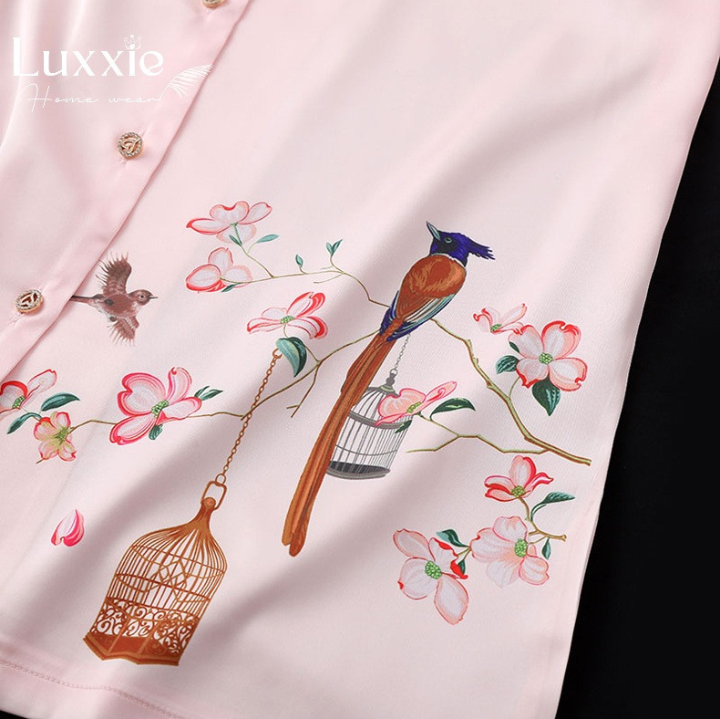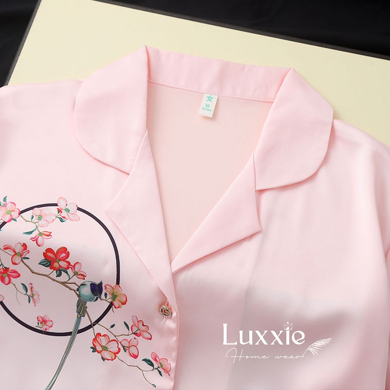 Pijama lụa họa tiết chim én & hoa đào – biểu tượng của vẻ đẹp quý phái, nhẹ nhàng và tinh tế , giúp nàng luôn nổi bật dù chỉ là trong không gian riêng tư.