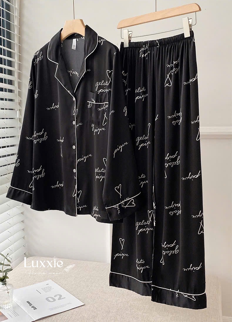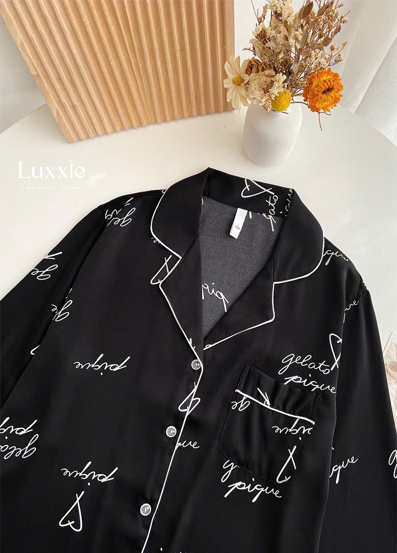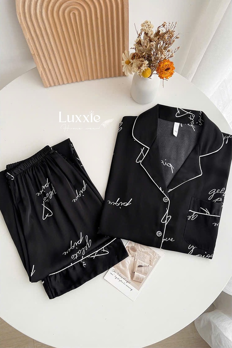Bộ đồ ngủ lụa đen họa tiết chữ - một thiết kế không chỉ tôn lên vẻ đẹp quý phái mà còn mang lại sự mềm mại và thoải mái tuyệt đối. Đẳng cấp từ từng chi tiết nhỏ!