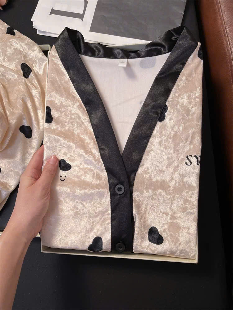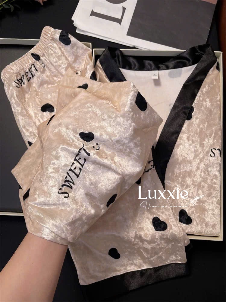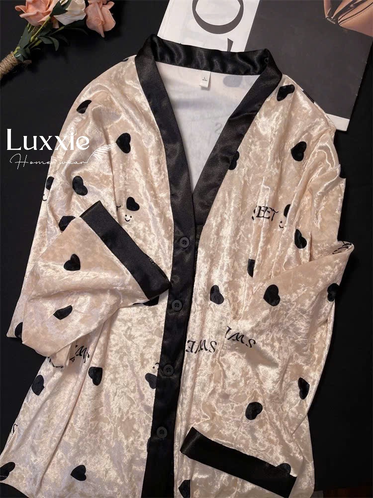NHUNG04 Bộ ngủ nhung vàng họa tiết trái tim kiểu dáng kimono